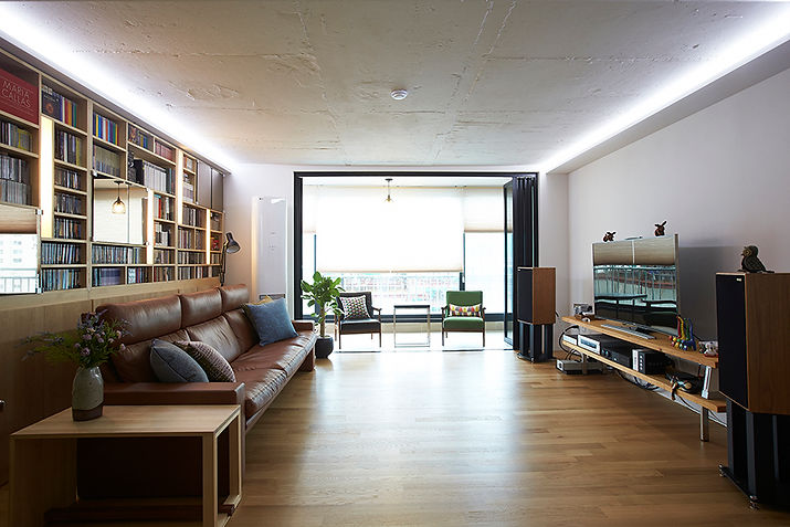 Classic Music 애호가인 건축주 부부는 보유하고 있는 CD와 DVD, 관련 서적들이 상당했고, 음반의 유지관리, 특히 먼지가 타지 않기를 바랬다. CD장의 모듈은 크기에 따라 각각 손가락 하나 들어가 빼낼수 있는 사이즈로 설정하고, CD장 상부의 일부 칸은 문을 달때 전체적으로 무거워 보이지 않는 디자인을 위해 동경銅鏡 을 사용했다.